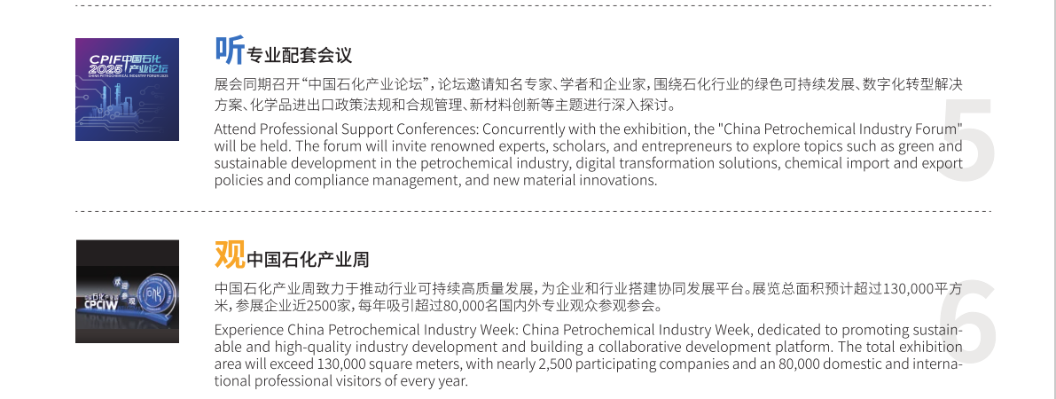 以“中国国际化工展”为核心,与“中国国际橡胶技术展”和“中国国际胶粘剂及密封剂展”共同打造的“中国石化产业周”,自2018年首次创建以来,致力于整合行业资源,延伸产业贸易链条,全力打造一年一度的石油和化工全产业交流盛会,为行业发展注入新的活力。