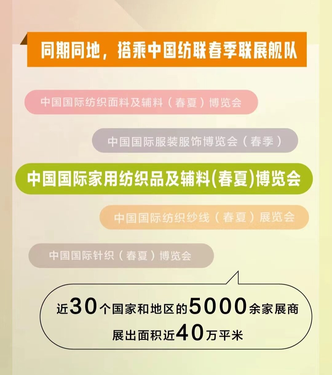 经过十数年的发展,中国国际家用纺织品及辅料博览会已发展成为亚太地区规模最大、最具影响力的家用纺织品类展览会。从开办以来,展览面积连年增加,展商观众数量屡创新高,吸引了来自全球的专业目光。 自2011年起,中国国际家用纺织品及辅料博览会再次完美升级,除了每年8月底的秋季展会,将全新推出“中国国际家用纺织品及辅料(春夏)博览会”!